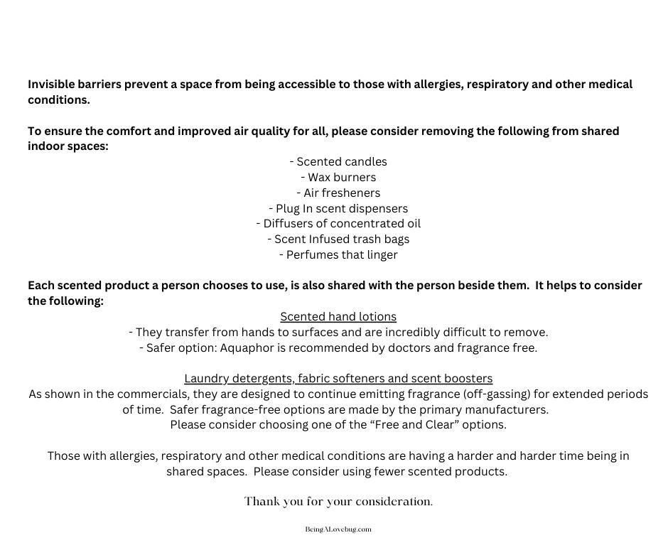 Once the intolerance develops, the reactions increase to include, among other things, cognitive impairment, respiratory distress, nausea, vomiting, heart palpitations . . . the list goes on and no two people experience the effects in exactly the same way. The effects of exposure continue long after the person leaves the space, impacting bodily functions for hours to days later. This means we are no longer able to be in shared workplaces due to fragrance on coworkers and scented devices. We are unable to access health care due to office staff that won't adhere to fragrance policies. We are excluded, or exclude ourselves, from family gatherings. Social interactions cease. We need YOUR help to make spaces breathable again. Thank you for being here, learning more and know that every little change you make IS appreciated.